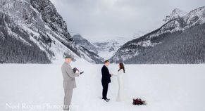 A winter wedding at Lake Louise is truly a magical experience — and Doug and Rebecca’s elopement proved just how stunning it can be. They traveled from Chicago to say their wedding vows on the frozen lake in front of the majestic Fairmont Chateau Lake Louise. With fresh snow, towering mountain peaks, and a quiet, peaceful atmosphere, this destination was everything they’d dreamed of.